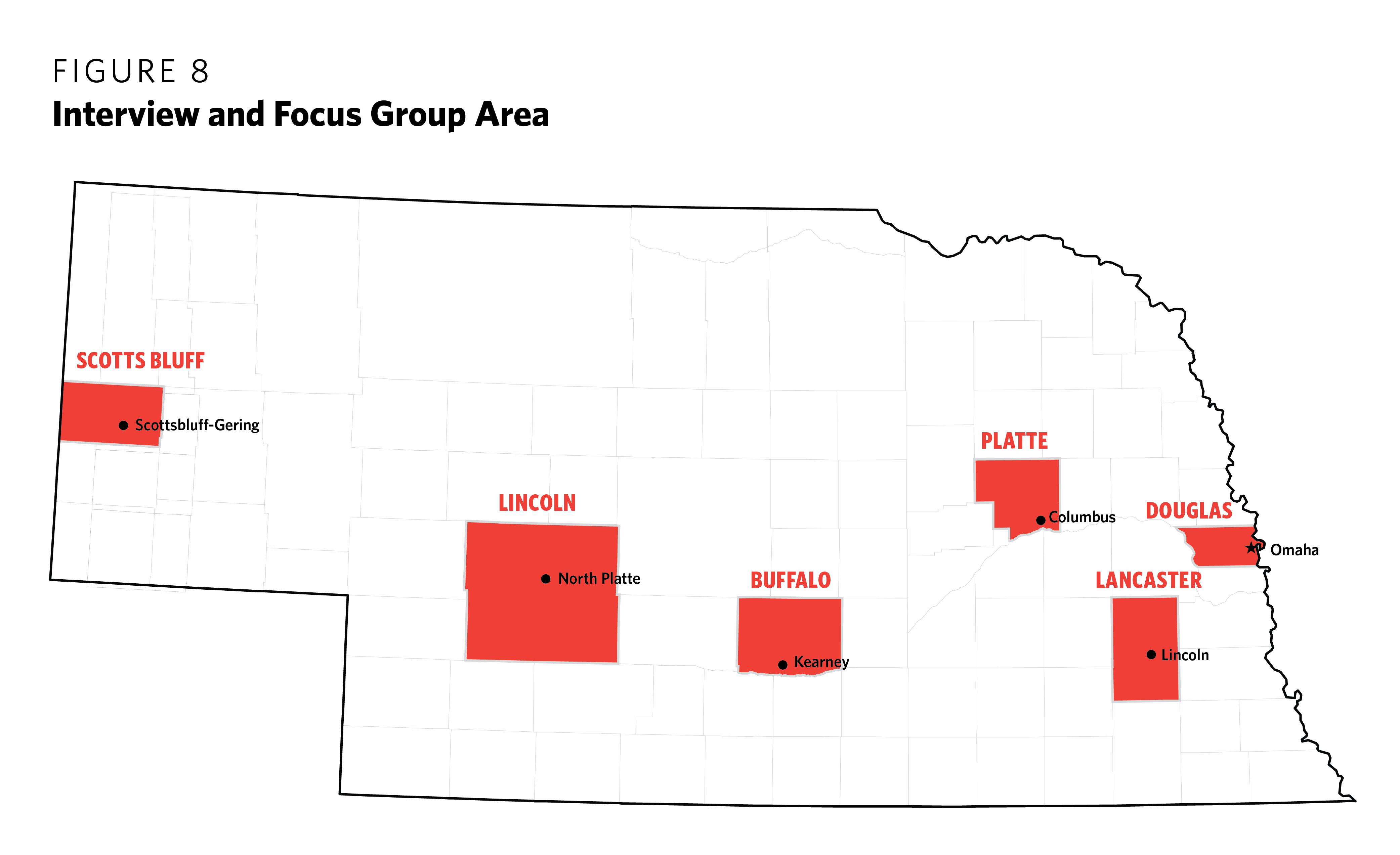 In addition to interviews and focus groups, the research team considered information from the recently completed Blueprint Nebraska survey. Blueprint Nebraska is a strategic plan developed by a group of business, industry, and civic leaders who released a report, which was partly based on a survey of the economic concerns of Nebraskans and which offered a detailed set of proposals for addressing them. The Blueprint Nebraska plan was established based on a survey that gave Nebraskans the opportunity to provide feedback on various topics including agriculture; banking and finance; community vitality; educational attainment; energy and natural resources; entrepreneurship; healthcare; housing; leadership, diversity, and inclusion; manufacturing; mega-sites for future development; military and veterans’ affairs; taxation and incentives; technology and innovation; transportation; and workforce.