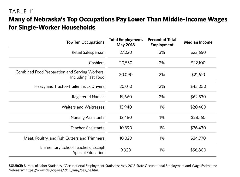 Finally, Nebraska is an excellent example of how the very nature of the middle-class household has changed over the years. Many families secure a middle income by working longer hours, holding multiple jobs at once, and maintaining dual-income households. Nebraska is ahead of the national average in many of these areas, making it a state with especially high labor force participation.