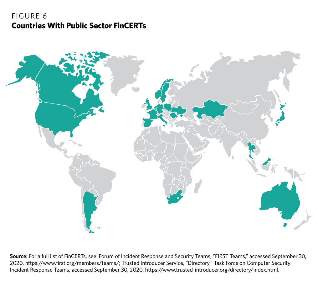 (South Korea) Financial Security Institute (FSI): The Financial Security Institute was established by the South Korean government in 2015 to protect their financial sector.119 FSI’s CERT, known as FSI-CERT, is a member of the Forum of Incident Response and Security Teams (FIRST).