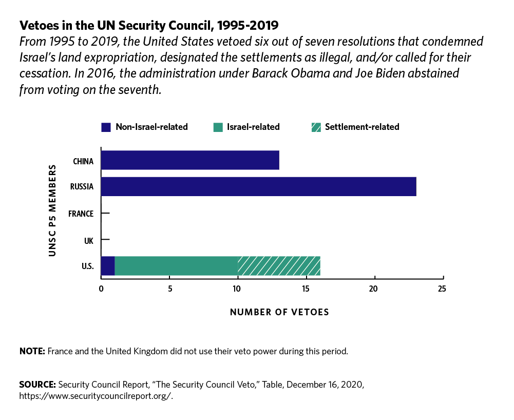 Uphold international law and United Nations (UN) resolutions on the Israeli-Palestinian conflict by refraining from using U.S. vetoes at the UN Security Council and working cooperatively with UN agencies and other multilateral mechanisms in support of the recommendations outlined here.