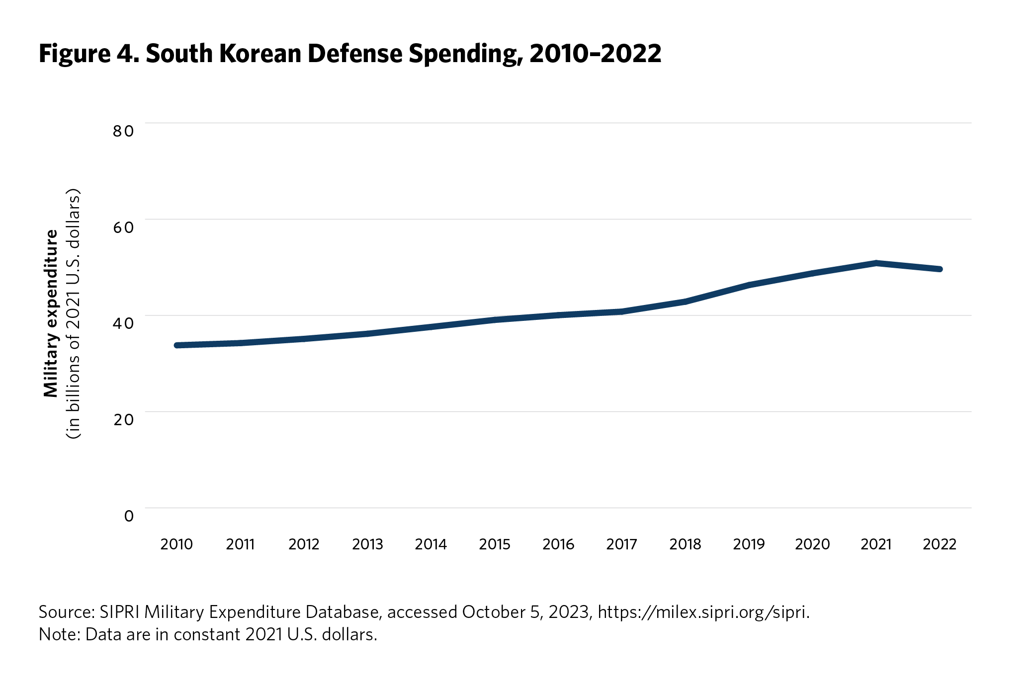South Korean progressives, who generally favor strategies of engagement toward North Korea, have nevertheless also supported these investments. Former president Moon not only sustained the K3 suite of capabilities but oversaw a substantial increase in defense spending compared to his two conservative predecessors.51 Even as the Moon administration pursed diplomacy with North Korea, South Korea’s defense spending saw year-on-year increases of 7 percent in 2018 and 8.2 percent in 2019 (see figure 4).52 An important driver of this spending was the stated interest of the Moon administration—consistent with earlier progressive administrations—in “the early takeover of wartime operational control.”53 One of the peculiarities of the U.S.–South Korea alliance is that the United States would maintain wartime operational control (OPCON) of the military forces of both sides. The two countries have agreed to transfer wartime operational control to South Korea eventually, but this is now premised on the Conditions Based OPCON Transition Plan. At their forty-sixth Security Consultative Meeting in 2014, the two countries’ defense ministers agreed that the transition would take place when “critical ROK and Alliance military capabilities are secured and the security environment on the Korean Peninsula and the region is conducive to a stable OPCON transition.”54 Seoul’s K3 systems are among the set of capabilities—including broader advances in command, control, communications, and intelligence, surveillance, and reconnaissance—that will be critical to realizing a conditions-based OPCON transfer. South Korean progressives, while generally supportive of the alliance with the United States, seek OPCON transfer as a matter of national sovereignty. Separately, progressive leaders have also emphasized that defense acquisitions should befit South Korea’s geopolitical status, implying that prestige considerations have also been prominent.55 For these reasons, continued investments in autonomous South Korean strike capabilities have persisted despite the presidential transition between conservatives and progressives.