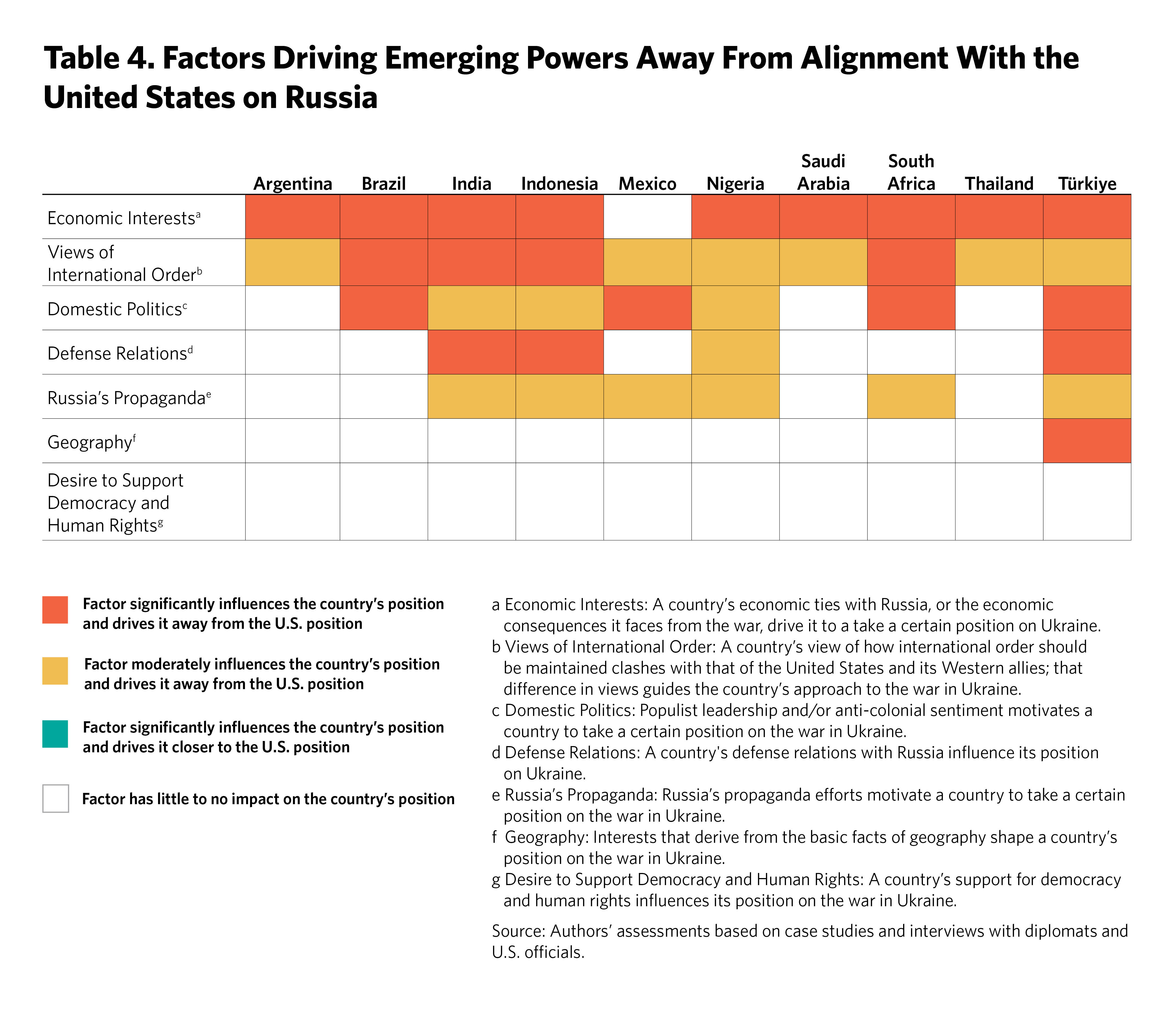 To assess the positions of these ten emerging powers on the war in Ukraine and on U.S.-China competition, we analyzed how they voted on several UN General Assembly resolutions, as well as their trade and investment patterns with China, Russia, and the United States. We also examined public statements by their leaders, the nature of their defense relationships, and their diplomatic behavior over time. In addition, we conducted off-the-record interviews with high-level diplomats from these countries about their positions on the war in Ukraine, China, and the international order. We sought to ascertain the extent to which these positions were shaped by their economic interests, domestic politics, geographies, visions of the international order, Chinese or Russian propaganda, and concerns for democracy and human rights abroad. We also held off-the-record roundtables with key senior officials from the White House, in an effort to understand their thinking and perspectives on the policy challenges for the United States. In the process, we published individual case studies for each country.7